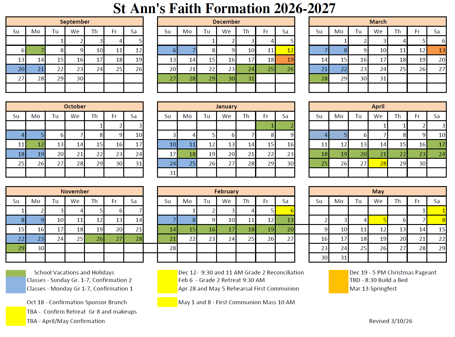 Children attending parochial schools in grades 1-7 and plan to receive First Communion at St Ann’s are only required to attend the second year of Faith Formation classes (grade 2). We would encourage them to attend Grade 1 but as they participate in daily religion classes at their parochial school, the first year of faith formation is not mandatory. Students preparing for Confirmation at St. Ann’s and attending parochial schools ARE required by Diocesan statutes to attend both years of the Faith Formation Confirmation program in their home parishes to be eligible to receive the sacrament in the spring of the second year.